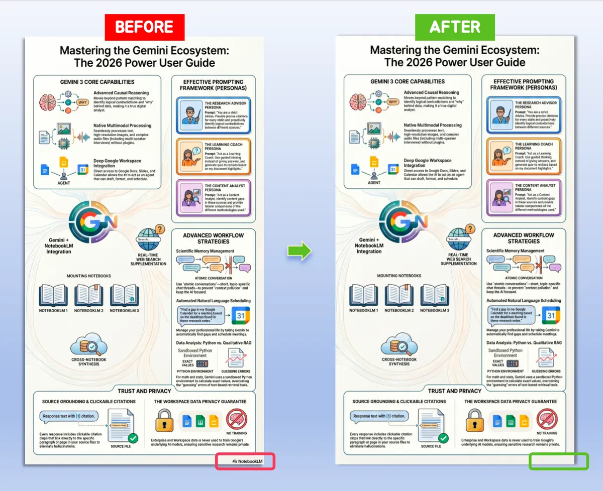NotebookLM visuals can include labels, charts, or gradients. Always inspect the lower-right corner before using the cleaned image publicly.